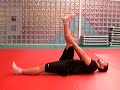 "Tumbado boca arriba con las piernas estiradas. Eleva una pierna hacia arriba sujetandola con ambas manos.
